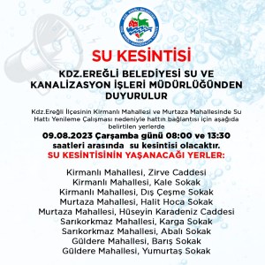 Kdz.Ereğli İlçesinin Kirmanlı Mahallesi ve Murtaza Mahallesinde Su Hattı Yenileme Çalışması nedeniyle hattın bağlantısı için aşağıda belirtilen yerlerde 09.08.2023 Çarşamba günü 08:00 ve 13:30 saatleri arasında su kesintisi olacaktır.