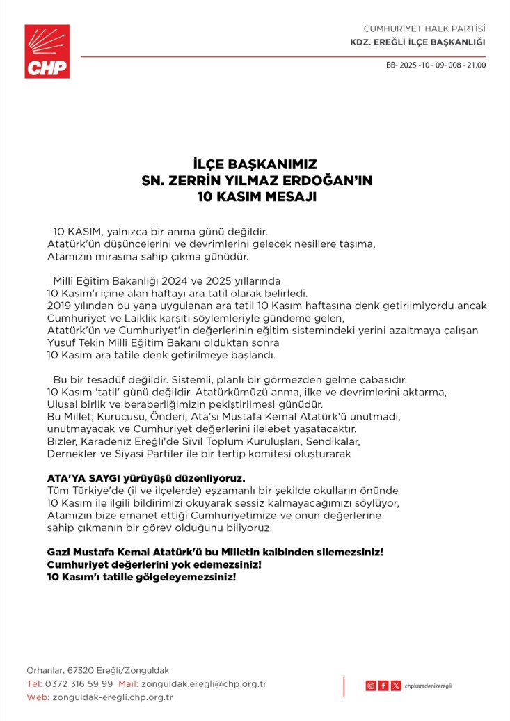 Bizler, Karadeniz Ereğli'de Sivil Toplum Kuruluşları, Sendikalar, Dernekler ve Siyasi Partiler ile bir tertip komitesi oluşturarak ATA'YA SAYGI yürüyüşü düzenliyoruz. Tüm Türkiye'de (il ve ilçelerde) eşzamanlı bir şekilde okulların önünde 10 Kasım ile ilgili bildirimizi okuyarak sessiz kalmayacağımızı söylüyor, Atamızın bize emanet ettiği Cumhuriyetimize ve onun değerlerine sahip çıkmanın bir görev olduğunu biliyoruz.