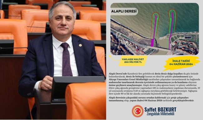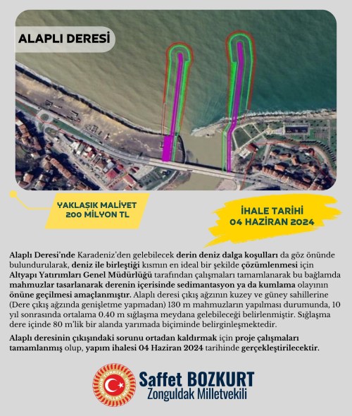Alaplı deresinin çıkışındaki sorunu ortadan kaldırmak için proje çalışmaları tamamlanmış olup, yaklaşık maliyeti 200 Milyon TL olan işin yapım ihalesi 04 Haziran 2024 tarihinde gerçekleştirilecektir.''