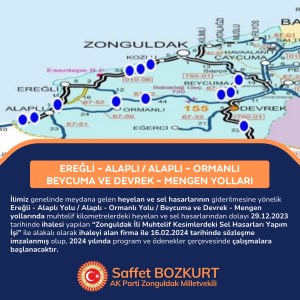 İlimiz genelinde meydana gelen heyelan ve sel hasarlarının giderilmesine yönelik Ereğli - Alaplı Yolu / Alaplı - Ormanlı Yolu / Beycuma ve Devrek - Mengen yollarında muhtelif kilometrelerdeki heyelan ve sel hasarlarından dolayı 29.12.2023 tarihinde ihalesi yapılan “Zonguldak İli Muhtelif Kesimlerdeki Sel Hasarları Yapım İşi” ile alakalı olarak ihaleyi alan firma ile 16.02.2024 tarihinde sözleşme imzalanmış olup, 2024 yılında program ve ödenekler çerçevesinde çalışmalara başlanacaktır.