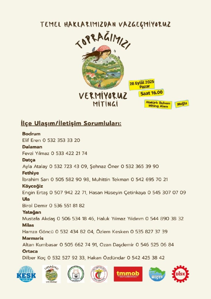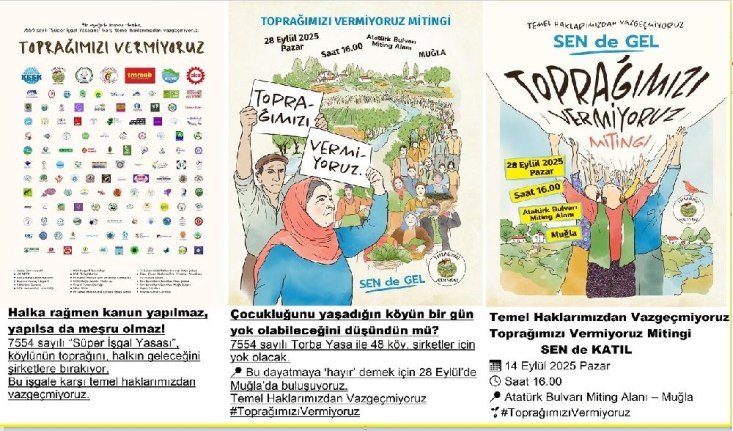 28 Eylül'de TOPRAĞIMIZI VERMİYORUZ MUĞLA MİTİNGİ, neredeyse eksiksiz muhalefet partilerinin, geniş bir muhalefet cephesinin, sendikaların, meslek odalarının, kadın-çevre ve dayanışma örgütlerinin en üst organlarıyla katıldığı bir miting olacak.