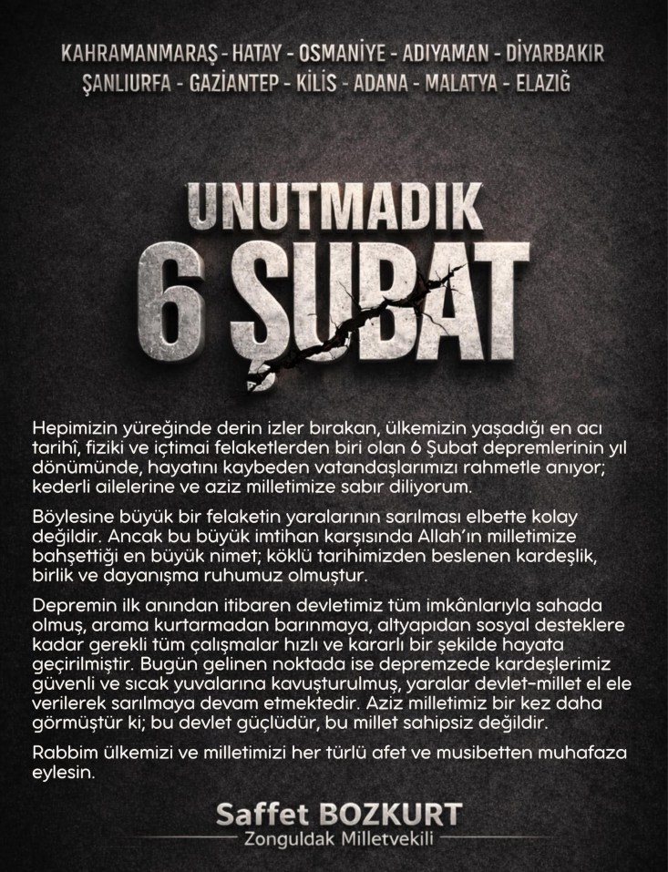AK Parti Zonguldak Milletvekili Saffet Bozkurt 6 Şubat depreminde hayatını kaybedenleri rahmetle andı.
