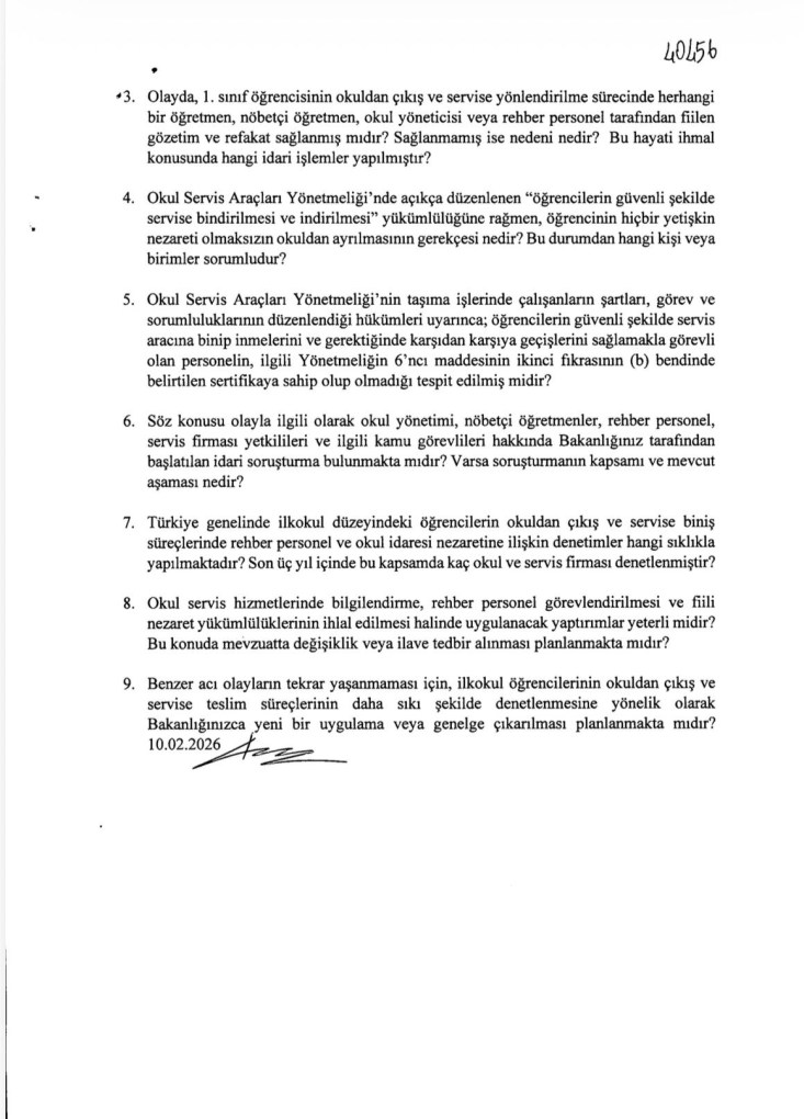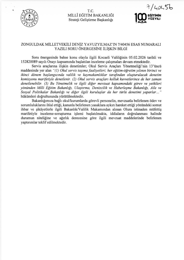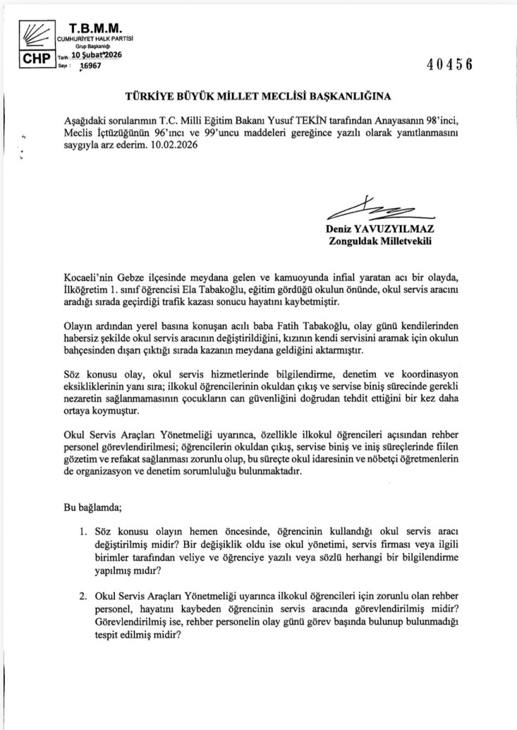 CHP Genel Başkan Yardımcısı ve Zonguldak Milletvekili Deniz Yavuzyılmaz’ın, Gebze’de 7 yaşındaki Ela Tabakoğlu’nun okul servisini ararken can verdiği feci kazaya ilişkin Milli Eğitim Bakanlığı’na yönelttiği soru önergesi yanıtlandı. Bakanlık; Yavuzyılmaz’ın, servis değişikliğinden rehber personel yokluğuna kadar uzanan ağır ihmal iddialarına yanıt vermek yerine, ilgili yönetmelik maddelerini sıraladı.