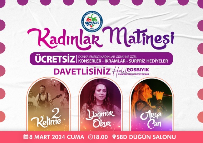 Kdz. Ereğli Belediyesi 8 Mart Dünya Emekçi Kadınlar Günü dolayısıyla ”Kadınlar Matinesi” düzenliyor. Ücretsiz etkinlikte Yağmur Okur, Arya Can ve 2 Kelime sahne alacak.