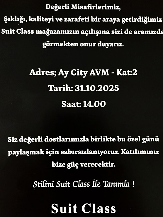 Karadeniz Ereğli ilçesinde, Hayati Eraydın'ın sahibi olduğu Suit Class mağazasının resmi açılışının, 31 Ekim Cuma saat 14.oo'da gerçekleştirileceği açıklandı.