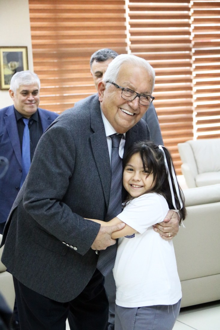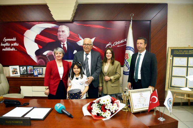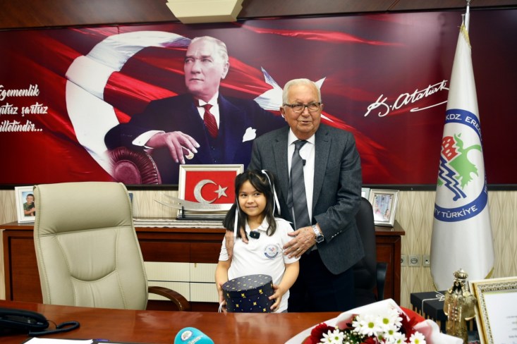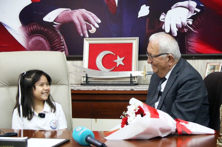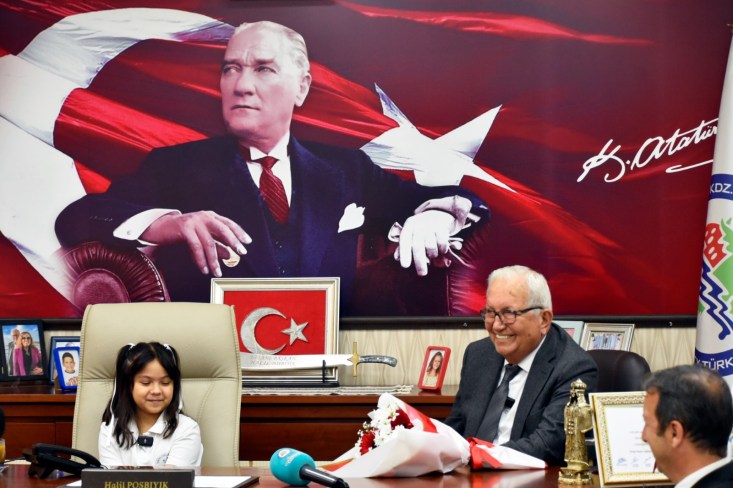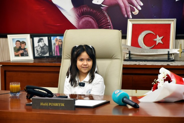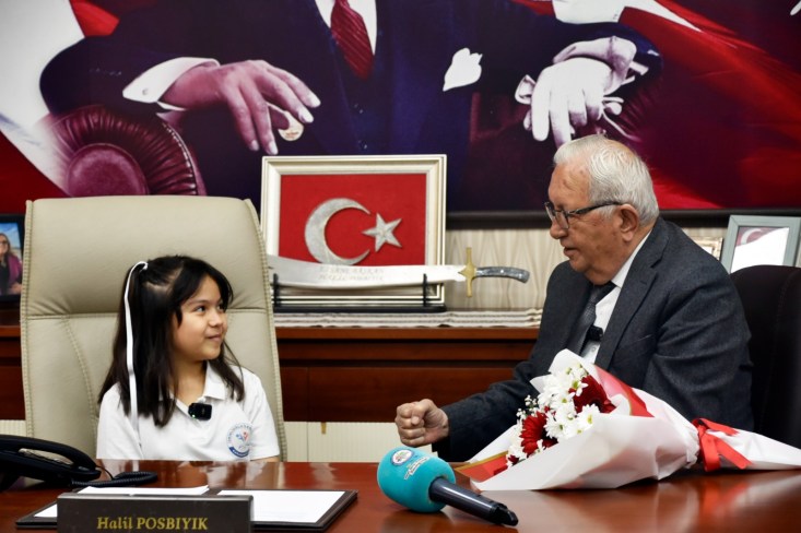 Okul Müdürü Cem Akbaş ve sınıf öğretmeni Figen Özcan ile birlikte başkan yardımcıları tarafından makamda karşılanan Aden Su Cebir, Başkan Posbıyık’a çiçek takdiminde bulundu. Koltuğa oturan Cebir, tüm çocukların Ulusal Egemenlik ve Çocuk Bayramı’nı kutladı.