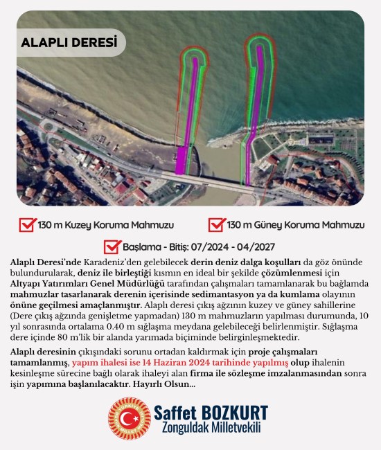 ''Alaplı Deresi’nde Karadeniz’den gelebilecek derin deniz dalga koşulları da göz önünde bulundurularak, deniz ile birleştiği kısmın en ideal bir şekilde çözümlenmesi için Altyapı Yatırımları Genel Müdürlüğü tarafından çalışmaları tamamlanarak bu bağlamda mahmuzlar tasarlanarak derenin içerisinde sedimantasyon ya da kumlama olayının önüne geçilmesi amaçlanmıştır.