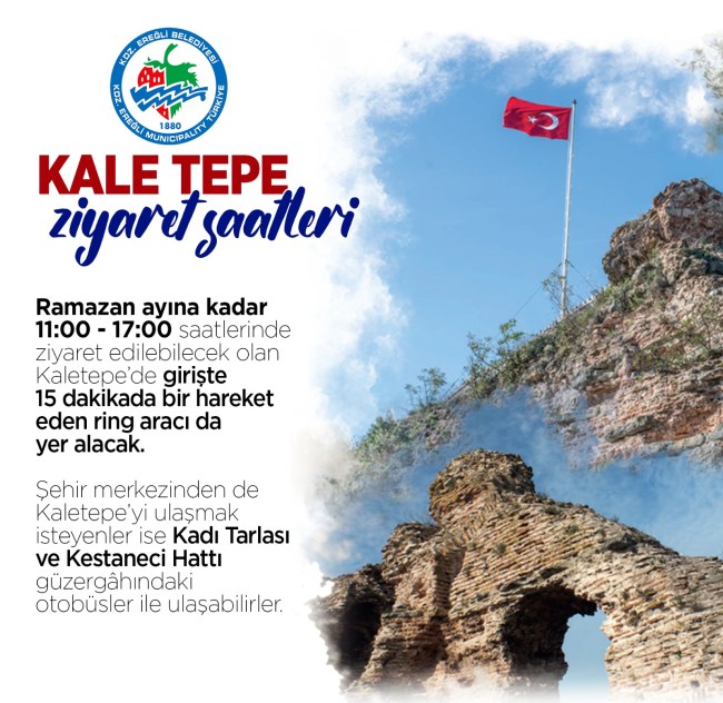 Ereğli turizmine önemli katkılar sağlayacak olan Kaletepe halkın hizmetine açıldı. Ramazan ayına kadar her gün belirli saatler arasında ziyaret edilebilecek olan tarihi alana çıkış işin Kaletepe girişinde ayrıca ring aracı da yer alacak.