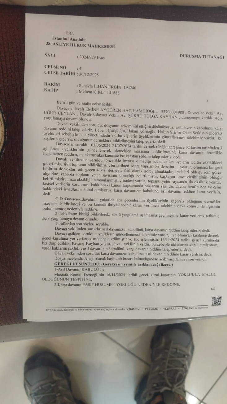 Mustafa Kemal Derneği ' nde yaşanan hukuk dışı üyelik iptalleri ve Ertuğrul Kudret Ünal in seçildiği genel kurulun yoklukla malul olduğu mahkeme kararı ile tespit edilmiştir