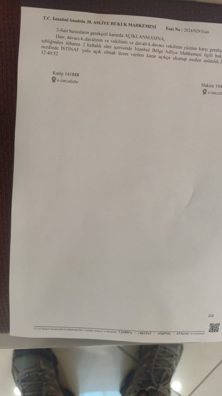 30 Aralık 2025 tarihli İstanbul Anadolu 38 Asliye Hukuk Mahkemesi 2025/929 Esas davamız taleplerimiz kabul edilerek karara çıkmıştır