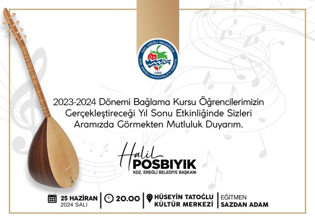 Kdz. Ereğli Belediyesi 2023-2024 dönemi Bağlama Kursu öğrencileri tarafından 25 Haziran 2024 Salı ‘Yıl Sonu Etkinliği’ düzenlenecek.
