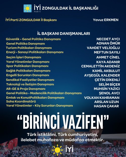 İl Başkanı Erkmen, “Ülkemizdeki siyasi istikrarsızlık artık önüne geçilemez bir durum almıştır. Ekonomi başta başta olmak üzere yeterli istihdam alanları yaratılmadığı için işsizlikte çığ gibi artmış ve artmaya da devam etmektedir. İşte, tüm bu sorunların çözümü noktasında sıkıntılara talibiz. Partimize olan üye kayıtlarının artması halkımızın İYİ Parti’ye olan teveccühü’nün bir göstergesidir. Halkımızın bize olan güvenlerine layık olmak için Zonguldak’ta da çalışmalarımıza derinlik kazandırmaya özen gösteriyoruz. Bu anlamda, İl Danışma Kurulumuzu oluşturduk görev alan arkadaşlarımıza başarılar diliyorum.