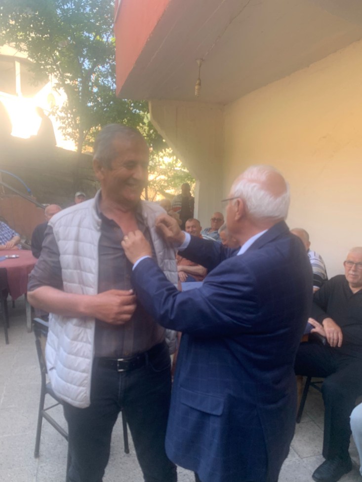 Göbü Köyü muhtarı Burhan Oral arkadaşımıza Göbü Köyümüzü ziyaretimizin anısına İl Başkanlığımızca özel hazırlattırılan Türk Bayrağı rozetimizi taktık ve ilgi alakasından ötürü teşekkür ettik.