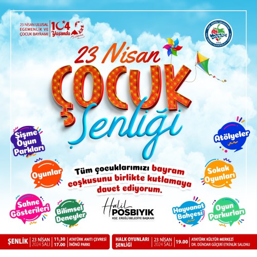 Belediye Başkanı Halil Posbıyık, tüm çocukları bayram coşkusunu birlikte kutlamaya davet ederek; “Sokak oyunları, oyun parkurları, bilimsel deneyler, şişme oyun parkları, hayvanat bahçesi, sahne gösterileri, atölyeler ve çeşitli oyunların yer alacağı şenlik düzenliyoruz. Sizleri, Dünya’da çocuklara armağan edilen tek bayram ve Türkiye Cumhuriyeti’nin ilk ulusal bayramı olan 23 Nisan Ulusal Egemenlik ve Çocuk Bayramı’nın 104. Yılının coşkusunu birlikte kutlamaya davet ediyorum” dedi.