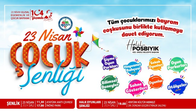 Kdz. Ereğli Belediyesi, 23 Nisan Salı Günü Çocuk Şenliği düzenliyor. Başkan Posbıyık, sokak oyunları, oyun parkurları, bilimsel deneyler, şişme oyun parkları, hayvanat bahçesi, sahne gösterileri, atölyeler ve çeşitli oyunların yer alacağı şenliğe tüm çocukları davet etti.