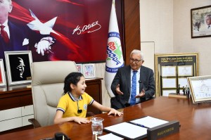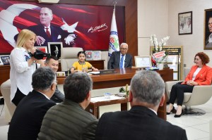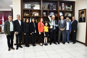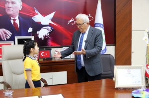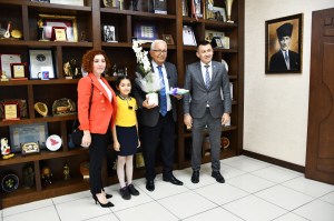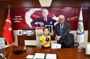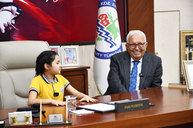Okul Müdürü Ali Demirbay ve sınıf öğretmeni Esin Çetin ile birlikte başkan yardımcıları tarafından makamda karşılanan Başak Yiğit, Başkan Posbıyık’ı seçim başarısı nedeniyle tebrik etti, çiçek takdiminde bulundu. Koltuğa oturan Yiğit, tüm çocukların Ulusal Egemenlik ve Çocuk Bayramı’nı kutladı.