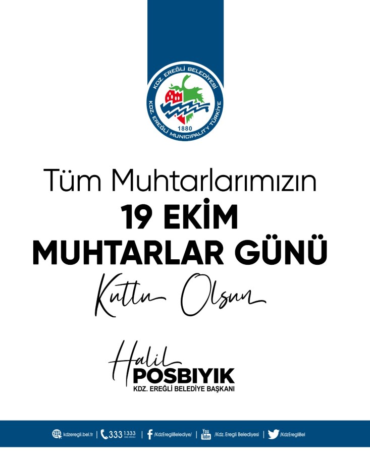 Kdz. Ereğli Belediye Başkanı Halil Posbıyık, 19 Ekim Muhtarlar Günü nedeniyle kutlama mesajı yayımladı.