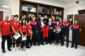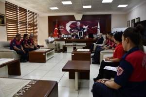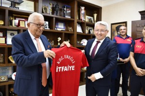 Başkan Yardımcısı Atilla Bulak ve İtfaiye Müdürü Muhammet Ali Ateş daha sonra itfaiye personeli ile Belediye Başkanı Halil Posbıyık’ı makamında ziyaret etti.