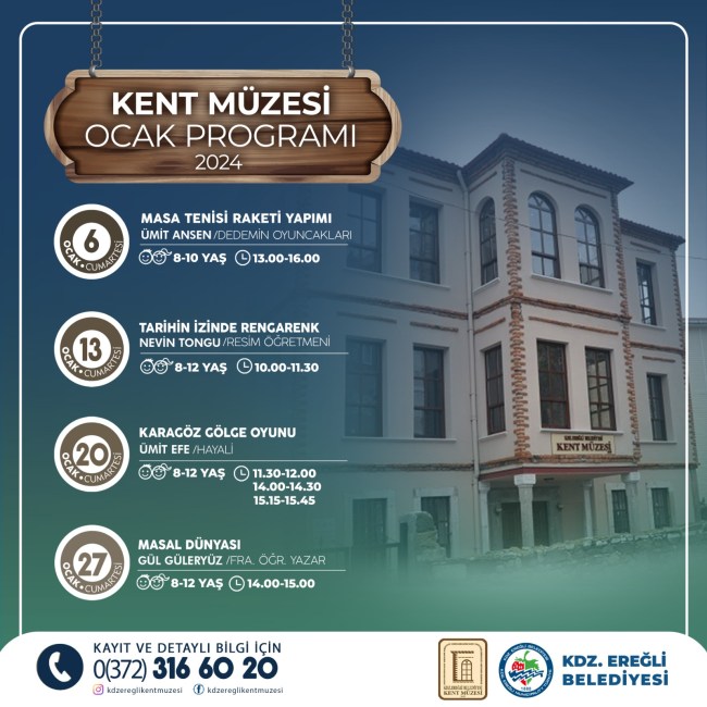 Kdz. Ereğli Belediyesi Kent Müzesi Ocak ayı programı belirlendi. Müzede, yarıyıl tatilini de kapsayan Ocak ayında, çocuklar için 4 hafta sonu farklı eğitmenlerle birlikte etkinlik ve atölyeler gerçekleşecek.