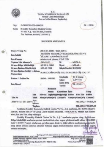 '' İlimiz Milas ilçesinde bulunan; Enerji ve Tabii Kaynaklar Bakanlığı Maden ve Petrol İşleri Genel Müdürlüğü’nden alınmış ruhsat, Çevre, Şehircilik ve İklim Değişikliği Bakanlığı’ndan ÇED belgesi, mevzuat gereği alınması gereken diğer kurum görüşleri doğrultusunda; Yeniköy-Kemerköy Termik santralleri için şirketin uhdesinde bulunan sahaya elektrik üretiminde kullanılmak üzere ilave kömür madeni işletme izni verilmiştir.