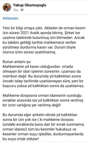 Çevre ve Ekoloji Hareketi Avukatları orman kesim izninin süresinin dolduğunu belgeledi. Sayın Okumuşoğlu, işimiz bitti diyen valilik'e cevaben, ( Bitmedi, daha yeni başlıyor işiniz! )''