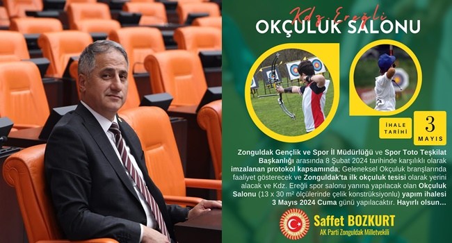 '' Zonguldak Gençlik ve Spor İl Müdürlüğü ve Spor Toto Teşkilat Başkanlığı arasında 8 Şubat 2024 tarihinde karşılıklı olarak imzalanan protokol kapsamında; Geleneksel Okçuluk branşlarında faaliyet gösterecek ve Zonguldak'ta ilk okçuluk tesisi olarak yerini alacak ve Kdz. Ereğli spor salonu yanına yapılacak olan Okçuluk Salonu (13 x 30 m² ölçülerinde çelik konstrüksiyonlu) yapım ihalesi 3 Mayıs 2024 Cuma günü yapılacaktır. Hayırlı olsun…''