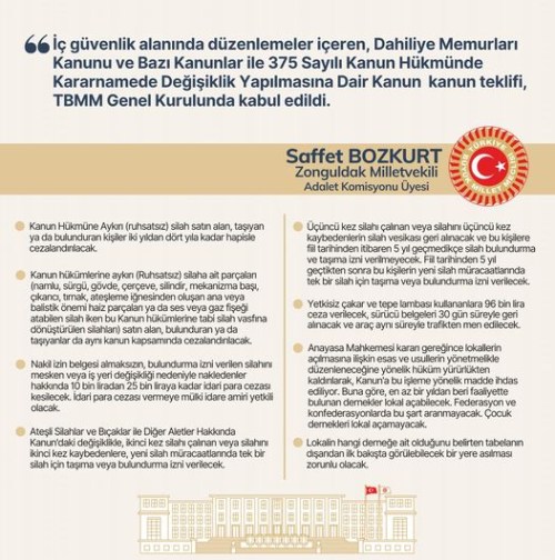 İç güvenlik alanında düzenlemeler içeren, Dahiliye Memurları Kanunu ve Bazı Kanunlar ile 375 sayılı Kanun Hükmünde Kararnamede Değişiklik Yapılmasına Dair Kanun Teklifi, TBMM Genel Kurulunda Kabul edildi.