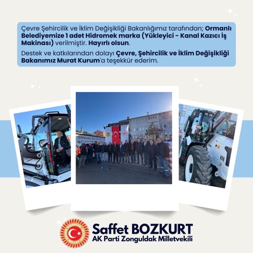 '' Çevre Şehircilik ve İklim Değişikliği Bakanlığımız tarafından; Ormanlı Belediyemize 1 adet Hidromek marka (Yükleyici - Kanal Kazıcı İş Makinası) verilmiştir. Hayırlı olsun.
