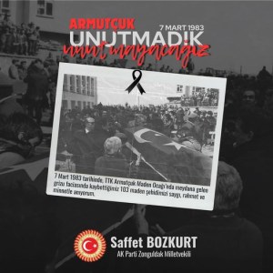 7 Mart 1983 tarihinde, TTK Armutçuk Maden Ocağı’nda meydana gelen grizu faciasında kaybettiğimiz 103 maden şehidimizi saygı, rahmet ve minnetle anıyorum.