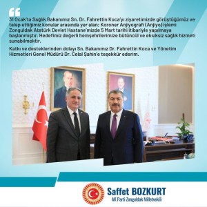 31 Ocak’ta Sağlık Bakanımız Sn. Dr. Fahrettin Koca’yı ziyaretimizde görüştüğümüz ve talep ettiğimiz konular arasında yer alan; Koroner Anjiyografi (Anjiyo) işlemi Zonguldak Atatürk Devlet Hastane’mizde 5 Mart tarihi itibariyle yapılmaya başlanmıştır.