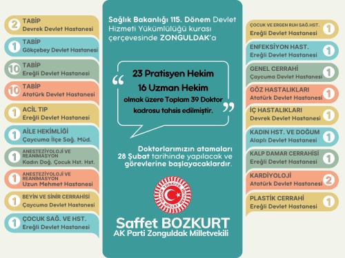''Sağlık Bakanlığı 115. Dönem Devlet Hizmeti Yükümlülüğü kurası çerçevesinde ZONGULDAK’a 23 Pratisyen Hekim, 16 Uzman Hekim olmak üzere Toplam 39 Doktor kadrosu tahsis edilmiştir.