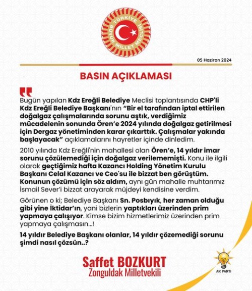 '' Bugün yapılan Kdz. Ereğli Belediye Meclisi toplantısında Sayın Belediye Başkanının “Bir el tarafından iptal ettirilen doğalgaz çalışmalarında sorunu aştık. Verdiğimiz mücadelenin sonunda Ören’e 2024 yılında doğalgaz getirilmesi için Dergaz yönetiminden karar çıkarttık. Çalışmalar yakında başlayacak” açıklamalarını hayretler içinde dinledim.