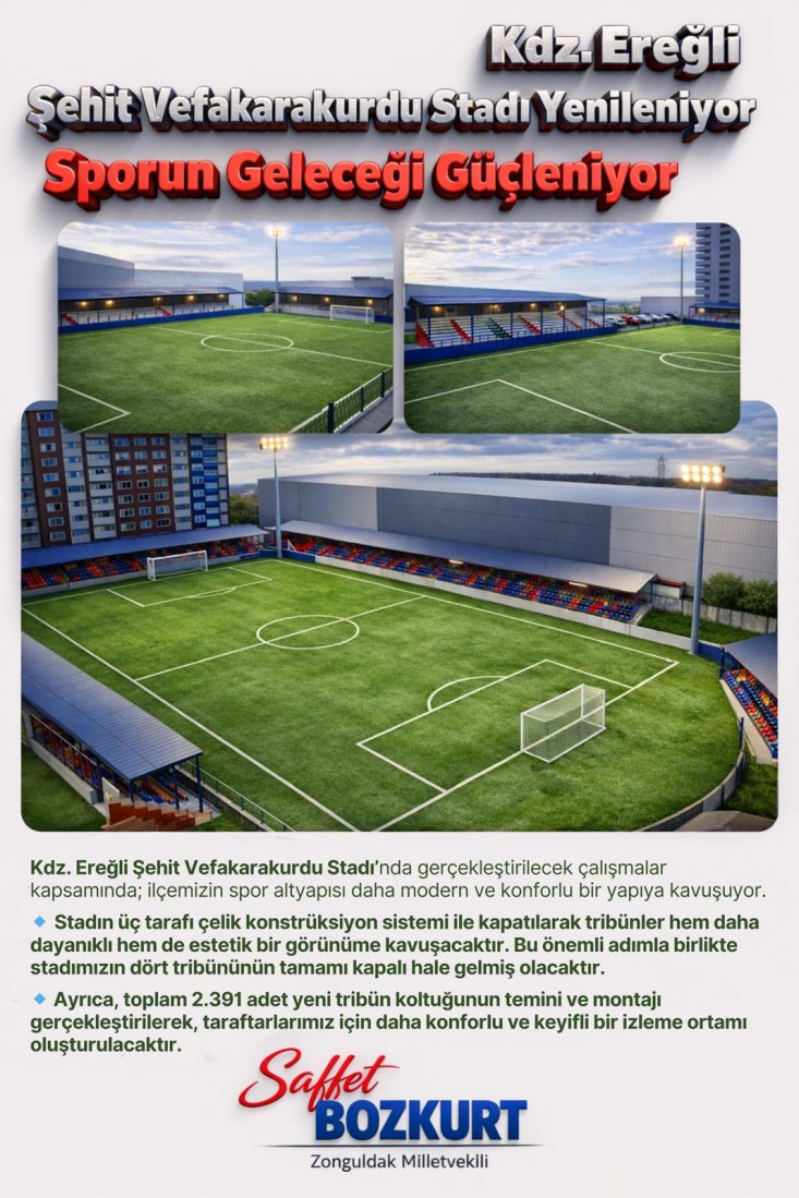 Kdz. Ereğli Şehit Vefakarakurdu Stadı’nda gerçekleştirilecek çalışmalar kapsamında; ilçemizin spor altyapısı daha modern ve konforlu bir yapıya kavuşuyor.