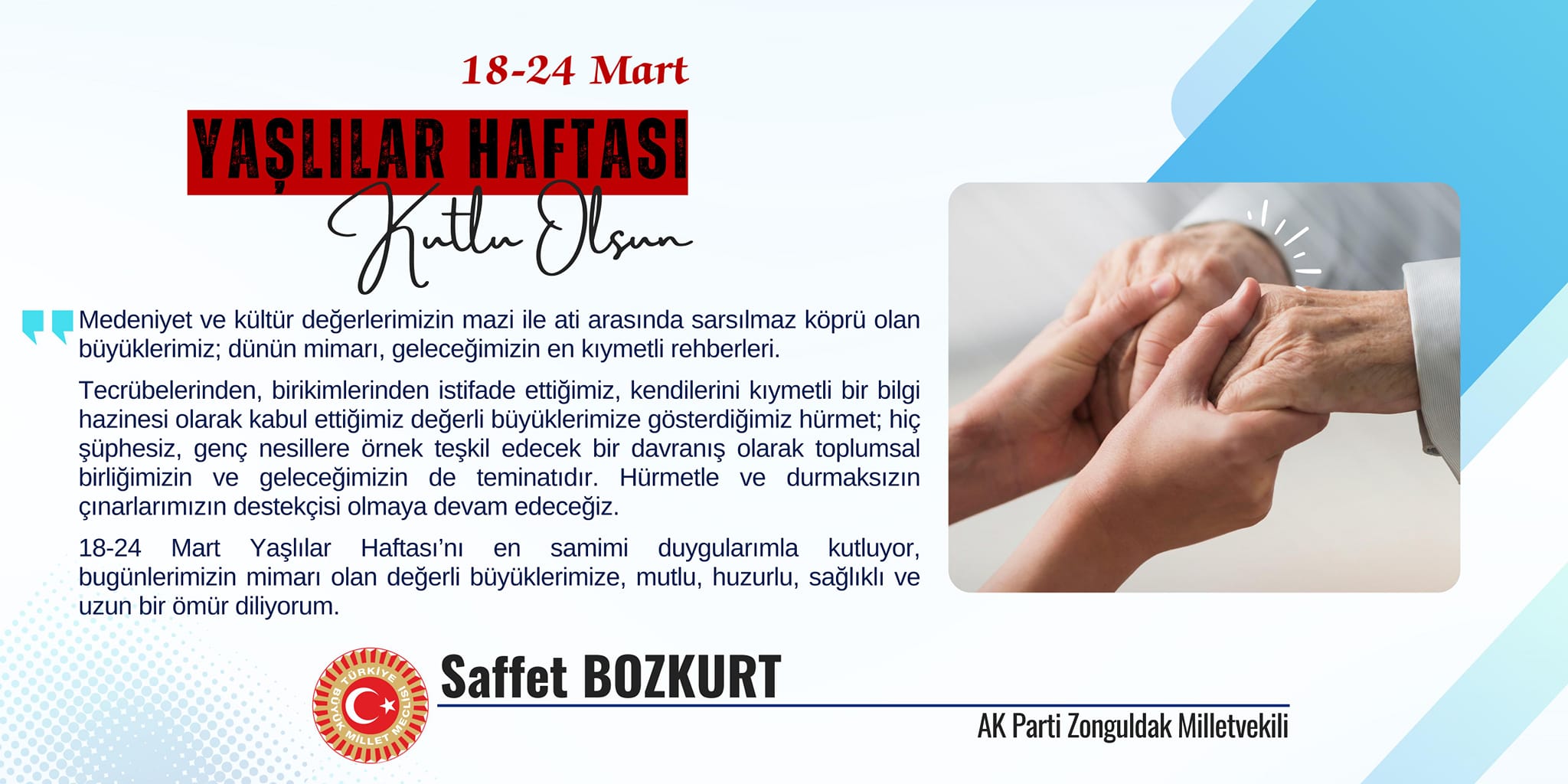 18-24 Mart Yaşlılar Haftası’nı en samimi duygularımla kutluyor, bugünlerimizin mimarı olan değerli büyüklerimize, mutlu, huzurlu, sağlıklı ve uzun bir ömür diliyorum.