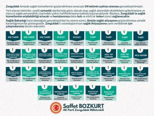 '' Zonguldak ilimizde sağlık hizmetlerinin güçlendirilmesi amacıyla 34 hekimin açıktan ataması gerçekleştirilmiştir.