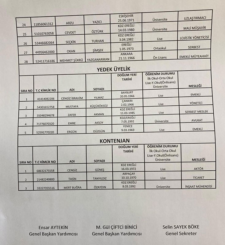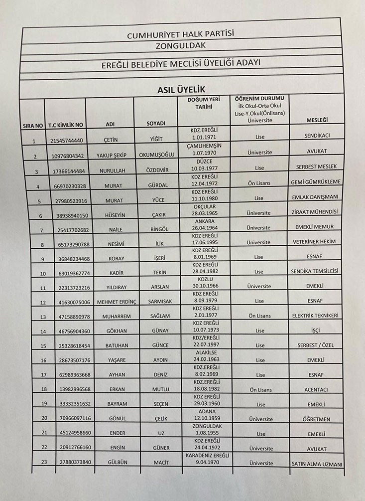 CHP Kdz.Ereğli Belediye Meclis üyeleri aday listesi