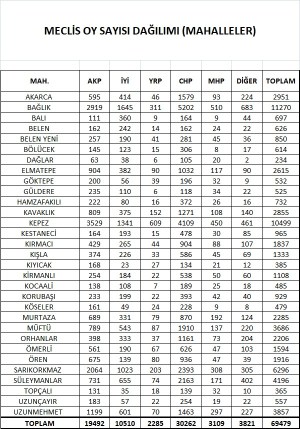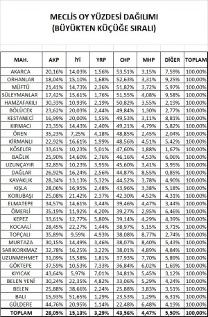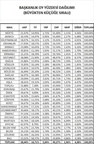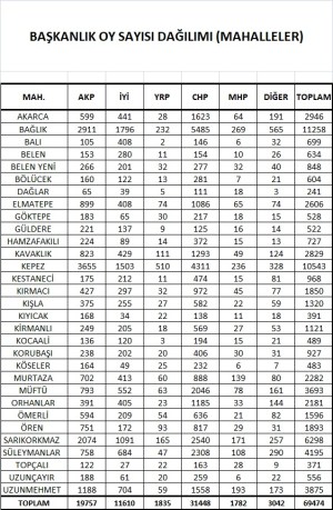 İşte Mahalle Mahalle Başkanlık ve Belediye Meclisi oy sayısı, oy yüzdesi ve (büyükten küçüğe sıralı) oy yüzde dağılımı;