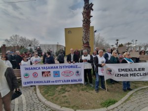 İzmir Konak’ta basın açıklaması düzenleyen emekliler ve EYT’liler açıklamada tepkileri şöyle dile getirdiler, “TÜİK, açıklamış olduğu enflasyon rakamlarıyla emeklileri fakirlikte eşitledi. Holdinglerin vergi borçlarını silmeye gelince para oluyor ama emekliye gelince para bulunmuyor? Aynı anda 6 kurumdan maaş alan bürokratlara ve eski siyasilere para bulunuyor, emekliye mi para bulunamıyor? Bu, asla kabul edilemez!”