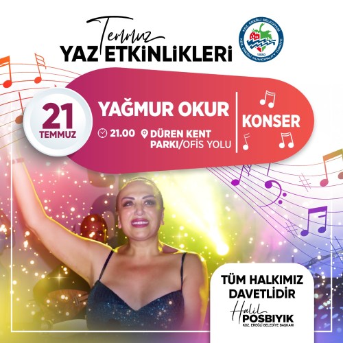 Pazar günü akşam ise Batı Karadeniz bölgesinin divası olarak bilinen Yağmur Okur konseri sizlerle olacak. Saat 21.00’da Düren Kent Parkı Ofis Yolu’nda Yağmur Okur, şarkılarıyla Ereğli halkını coşturacak.
