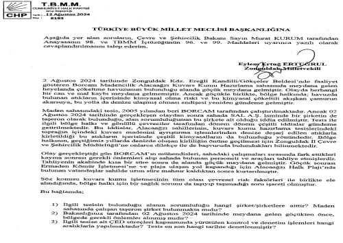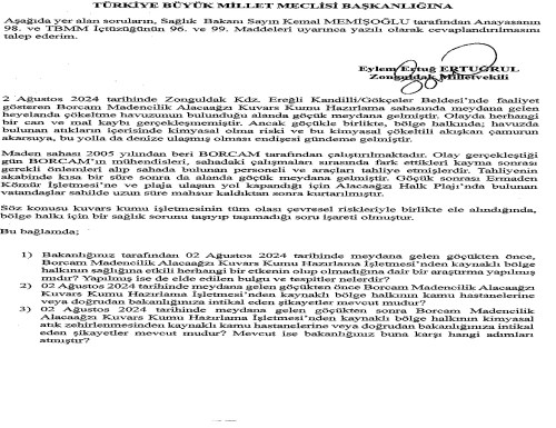 CHP Zonguldak Milletvekili Eylem Ertuğrul, Kdz. Ereğli'ye bağlı Kandilli/Gökçeler Beldesinde faaliyet göstermekte olan Borcam Kuvars maden sahasında, 2 Ağustos 2024 günü meydana gelen heyelan ile ilgili Sağlık Bakanlığı ve Çevre Şehircilik Bakanlığı’na soru önergesi verdi.