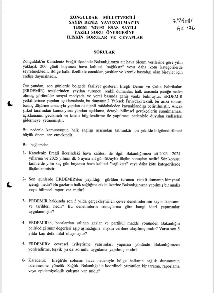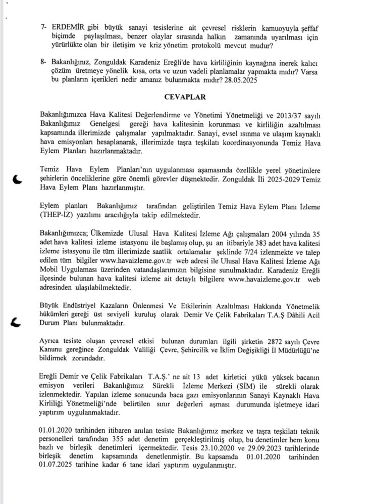 Yavuzyılmaz önergesinde; Karadeniz Ereğli’de Bakanlığa ait hava ölçüm verilerine göre yılın yaklaşık 200 günü boyunca hava kalitesinin “sağlıksız” veya daha kötü kategorilerde seyrettiğini hatırlatarak, özellikle çocuklar, yaşlılar ve kronik hastalar açısından ciddi bir halk sağlığı endişesi bulunduğunu vurgulamıştı.