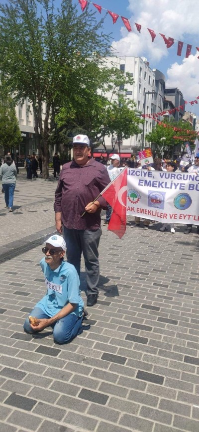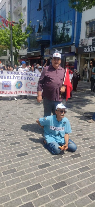 Etkinliğe dernek logosunun basılı olduğu pankartlarla katılan başkan ve dernek üyeleri emeklinin halini üstü başı yırtık, simit yiyen ve yerlerde sürünen biri olarak canlandırdı.