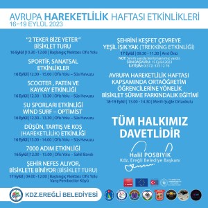 2002 yılından bu yana, her yıl 16-22 Eylül tarihleri arasında farklı ülkelerde kutlanan Avrupa Hareketlilik Haftası’nda, başvuruda bulunan 41 ülkede bulunan 2500 şehirden biri olan, kentimizde de Kdz.Ereğli Belediyesi ile birlikte çeşitli kurum ve kuruluşların işbirliğinde etkinlikler gerçekleştirilecek.