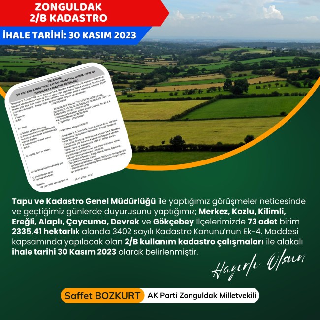 ''Tapu ve Kadastro Genel Müdürlüğü ile yaptığımız görüşmeler neticesinde ve geçtiğimiz günlerde duyurusunu yaptığımız; Merkez, Kozlu, Kilimli, Ereğli, Alaplı, Çaycuma, Devrek ve Gökçebey İlçelerimizde 73 adet birim 2335,41 hektarlık alanda 3402 sayılı Kadastro Kanunu’nun Ek-4. Maddesi kapsamında yapılacak olan 2/B kullanım kadastro çalışmaları ile alakalı ihale tarihi 30 Kasım 2023 olarak belirlenmiştir. Hayırlı Olsun.''