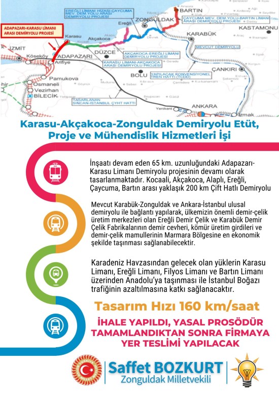 Kocaeli Akçakoca Alaplı Ereğli Çaycuma Bartın arası yaklaşık 200 kilometre çift hatlı demiryolu, mevcut Karabük Zonguldak ve Ankara İstanbul ulusal demiryolu ile bağlantı sağlanacak