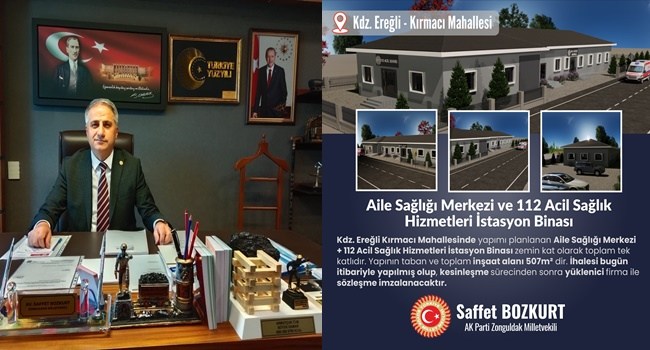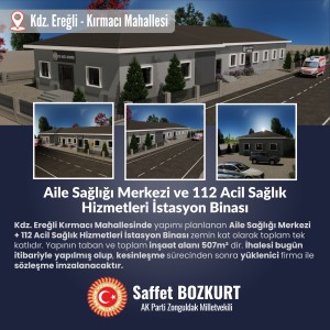 ''Kdz. Ereğli Kırmacı Mahallesinde yapımı planlanan Aile Sağlığı Merkezi + 112 Acil Sağlık Hizmetleri İstasyon Binası zemin kat olarak toplam tek katlıdır. Yapının taban ve toplam inşaat alanı 507m² dir. İhalesi bugün itibariyle yapılmış olup, kesinleşme sürecinden sonra yüklenici firma ile sözleşme imzalanacaktır.