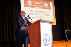 “Biz işçiyiz, emekçiyiz, üretiriz, üretimden gelen gücümüzü kullanırız. Bu enflasyonda sıcağa kar dayanmaz dedikleri gibi maaşlar eridi ancak sayın Belediye Başkanımız ek protokol yaparak çok güzel bir sözleşmeye imza attık. Bu enflasyonun sorumlusu belediye başkanları değil bu ülkeyi yönetenlerdir. Biz emekçiler, işçiler şapkamızı önümüze koyup düşünmek zorundayız. Sorunun kaynağını bilmek, kim emekten yana kim alın terinden yana, kim işçi çocuklarını da kendi çocukları gibi görüyor, kim işçinin ailesini de ailesi gibi görüyor bunu ayırt etmek zorundayız. Onun için Belediye Başkanımız Halil Posbıyık’a sendikam adına defalarca teşekkür etsek azdır. Bize bir adım atana bizde 10-20 adım geleceğiz sayın başkanım. Sizin yanınızdayız, sizinle her zaman gurur duyuyoruz. Bizler işçiyiz, siyaset yapmayız. Siyaseti siyasi partiler yapıyor. Ancak biz politika yaparız. Çünkü bizim hedefimiz çoluk çocuğumuzu namerde muhtaç ettirmemek, yaşamını, geçimini sağlamaktır. Başkanım her zaman emekçinin yanında oldu. Bizde her zaman onun yanında, emekten yana, Atatürk’ten yana Cumhuriyetten yana olan herkesin yanında olacağız. Belediye-İş sendikasının partisi yoktur. İlla parti deniyorsa partisinin adı Laik Türkiye Cumhuriyeti’dir. Liderinin adı da Mustafa Kemal Atatürk’tür. Bu ek sözleşmenin tüm üyelerimize hayırlı uğurlu olmasını diliyorum.”
