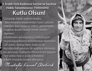 ''Hayatımızın her anına varlıklarıyla değer katan, desteklerini bizden hiç bir zaman esirgemeyen, emeğin ve fedakarlığın simgesi olan '' Kadın güçlüyse toplum da güçlüdür. '' cümlesini bizlere söyleten kadınlarımızın, Gazi Mustafa Kemal Atatürk'ün kadınlara değer vererek, çağdaş haklar ve özgürlükler ile birlikte; siyasi konularda ön plana çıkmalarının yolunu açarak, kadınlara seçme ve seçilme hakkının tanınmasının 5 Aralık Dünya Kadın Hakları Günü'nün 89. yıl dönümünü kutluyorum."