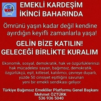 Türkiye Bağımsız Emekliler Platformu Genel Başkanı Mehmet Öztürk beyi kutluyorum özverili çalışmaları için.