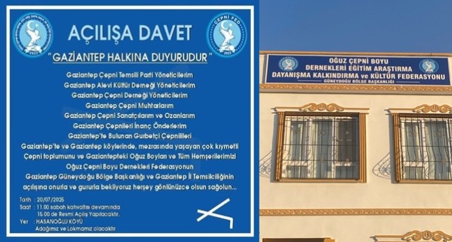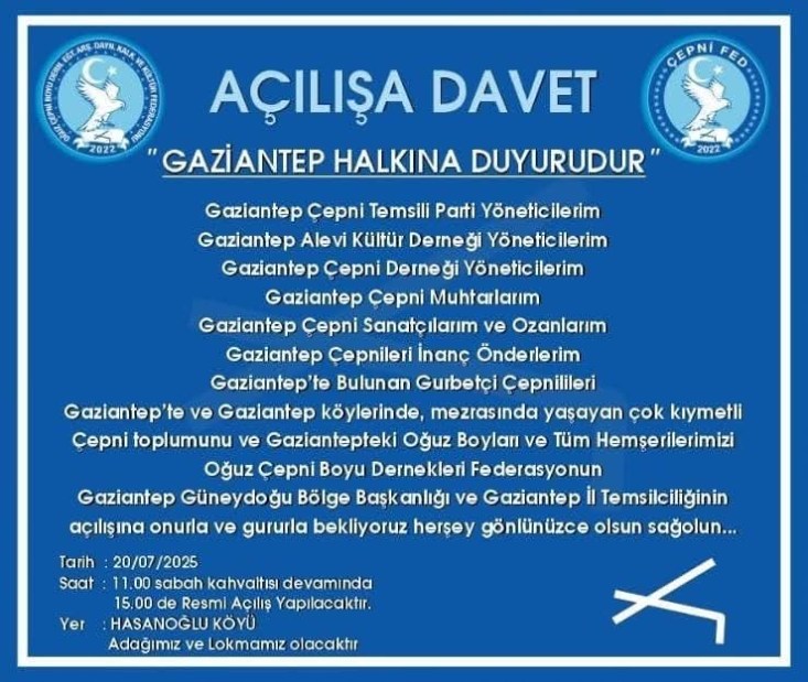 20 Temmuz 2025 Pazar Günü Gaziantep (Hasanoğlu Mah.) saat 11.00 de kahvaltı ile başlayacak ve saat 15.00 de resmi açılışı ile devam edecek olan " Oğuz Çepni Boyu Dernekleri Federasyonu Güneydoğu Anadolu Bölge Başkanlığı ve Gaziantep İl Temsilci Başkanlığı açılışımıza" herkes davetlidir.